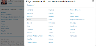Si queréis conocer cual es el trending topic del momento, es decir, el tema, debate, tweets más escrito del día o del momento, en el lateral izquierdo de la página de twitter os aparece, "a quién seguir" y debajo os viene un cuadro con el título "tendencias globales" os muestra los tweets más relevantes del mundo, pero si pincháis en cambiar, os aparece el listado de países, el cual queréis ver el trending topic.